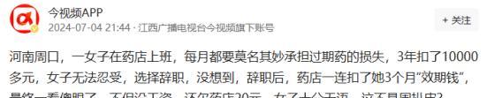 河南周口,一女子在药店上班,每月都要莫名其妙承担过期药的损失,3年扣了10000多元,女子无法忍受,选择辞职,没想到,辞职后,药店一连扣了她3个月“效期钱”,最终一看傻眼了,不但没工资,还欠药店20元,女子十分无语,这不是周扒皮?